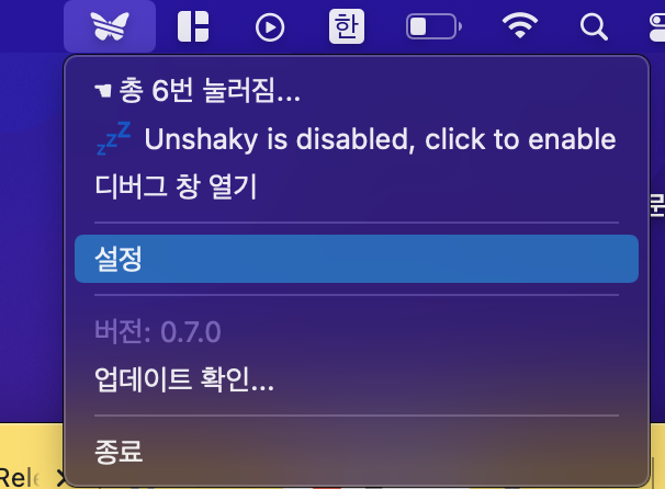 나비모양의 아이콘을 클릭해서 설정을 누른다.
